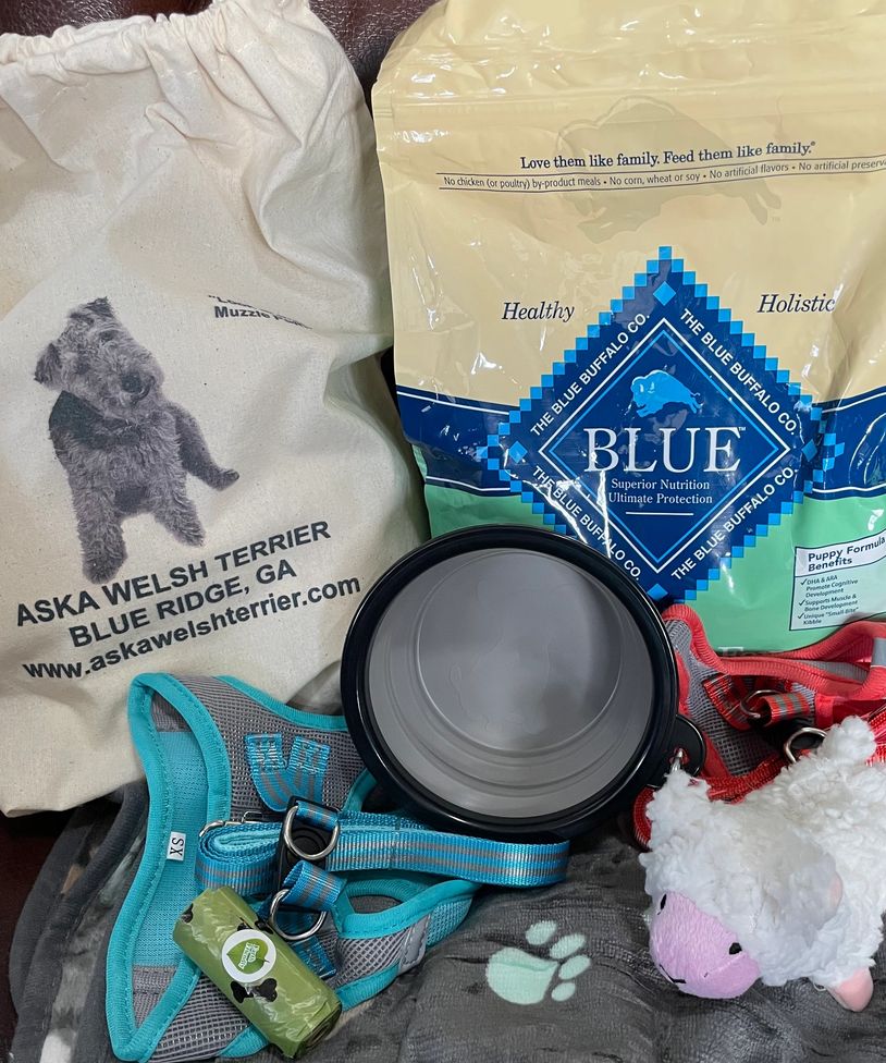 Our Welsh Terrier puppies will be sent home with a sling logo bag, 5lb bag of dry food, travel water bowl, harness and leash (pink or blue), poo bags, toy, vet health guarantee, the puppy’s vaccine log will be attached, registration application, and a blanket with mom’s and sibling’s scent to comfort the puppy.